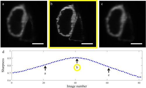 Fig. 7 Autofocusing experiment using sharpness metric of Equation 5 on an ex-vivo 4 dpf Zebrafish embryo’s heart (using setup 1). In this illustration, eighty-one images of the same plane inside the sample were taken using the SLM to move the sheet to different positions with respect to the imaging objective, and the motorized stage to move the sample with the light-sheet (with steps of 0.5 µm, for a total range of 40 µm). (a) and (c) show images taken with the light-sheet in an out-of-focus plane, while (b) is the image identified as the one with best focus according to the sharpness metric (i.e. light-sheet at the correct distance from the imaging objective). (d) Sharpness values, one for each image, with highest value indicating the plane of best focus. Note that in practice a smaller number of images would be taken, and the sharpness interpolated using an appropriate function, to quickly find the optimum focus. Scale bars: 50 µm.