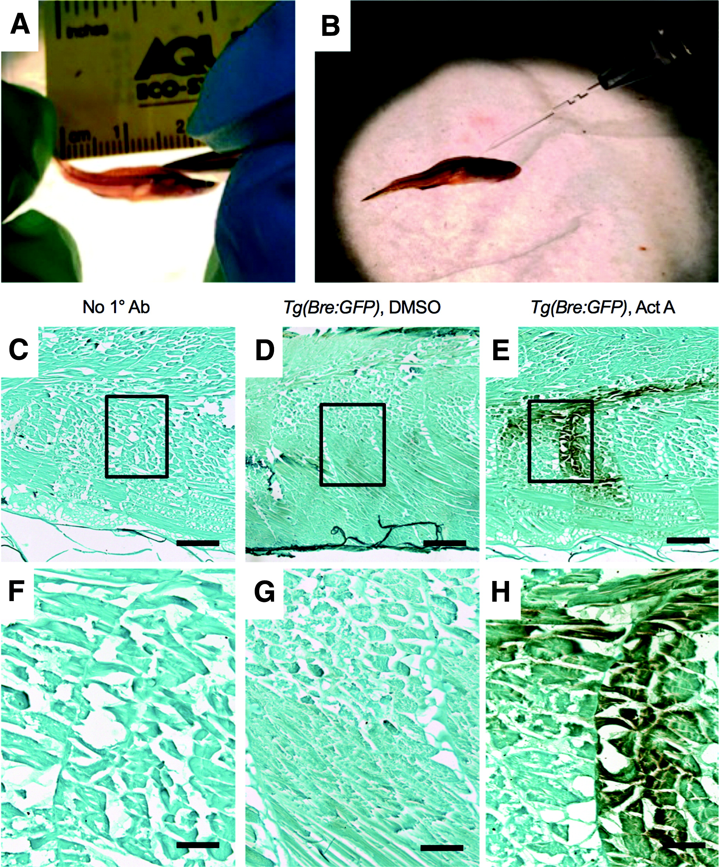 Fig. 1 rh activin A is detectable in zebrafish muscle tissue at 1 hpi. Before injection injury, adult zebrafish were anesthetized, and scales were gently removed from the right, dorsal side, just anterior to the dorsal fin (A). Zebrafish were injected at the descaled site with the indicated treatment using a microcapillary needle (B). To first test this model, adult Tg(Bre:GFP) zebrafish were injected with rh activin A (E: 5 × , H: 20 × ) or DMSO (D: 5 × , G: 20 × ), collected at 1 hpi, and analyzed for rh activin A expression by IHC. Act A was clearly detected at the Act A-injected injury site, and not in control DMSO or primary controls (C: 5 × , F: 20 × ). (F–H) Enlarged views of areas indicated by boxes in (C–E), respectively. n = 2 zebrafish per treatment group. (C–E) 5 × scale bar is 200 μm. (F–H) 20 × scale bar is 50 μm. Act A, activin A; DMSO, dimethyl sulfoxide; hpi, hours postinjury; IHC, immunohistochemistry; rh, recombinant human.