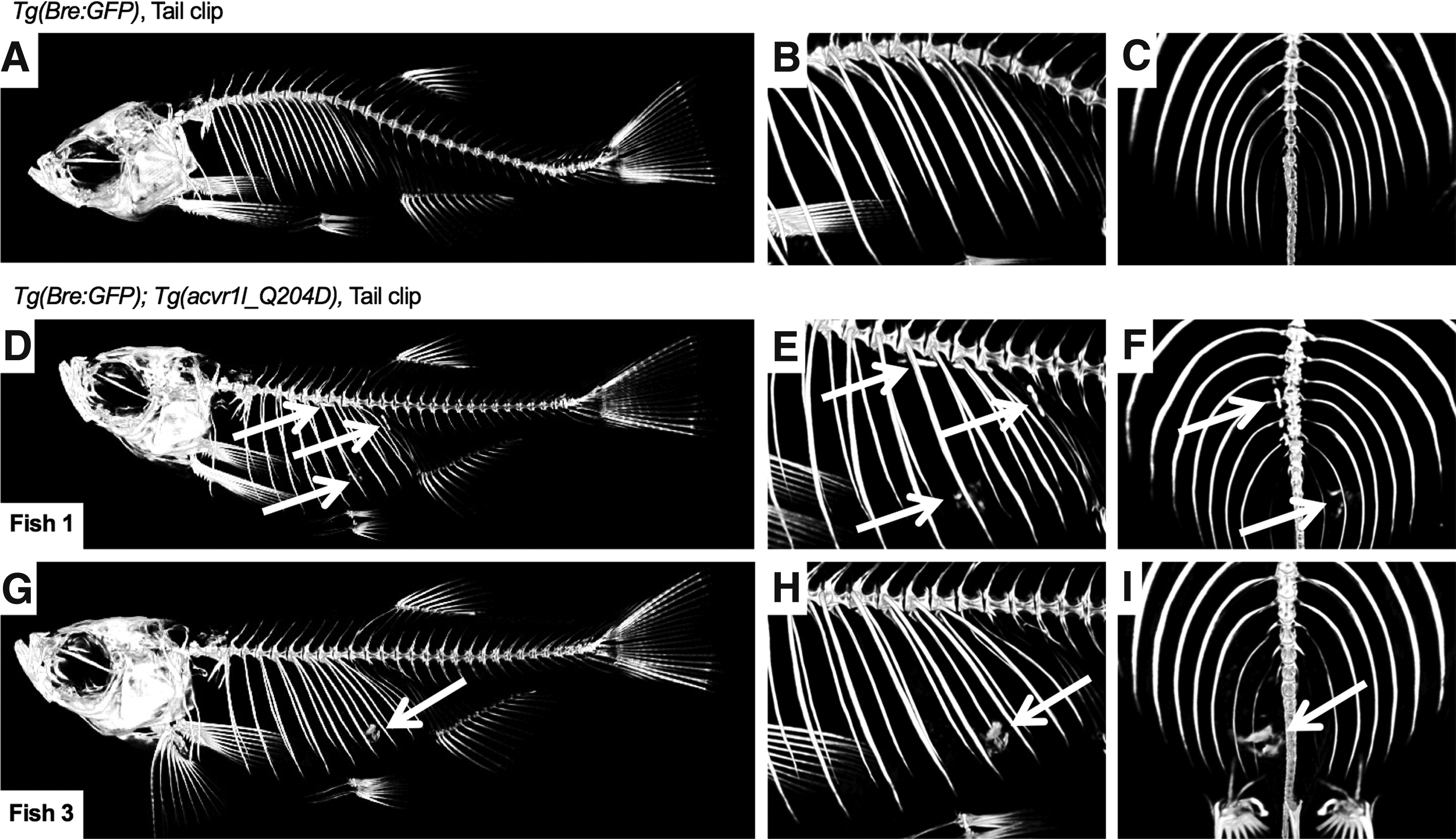 Fig. 6 Caudal fin clip-injured heat-shocked Tg(acvr1l_Q204D) zebrafish exhibited spinal and body cavity HO at 2 wpi. Micro-CT image of tail fin clip-injured HS Tg(Bre:GFP); Tg(acvr1l_Q204D-mCherry) zebrafish (D–I) at 2 wpi revealed the presence of HO in the body cavity and along the spine (D–I, arrows). Control fin clip-injured HS Tg(Bre:GFP) zebrafish did not exhibit detectable HO (A–C). n = 3 Tg(Bre:GFP); Tg(acvr1l_Q204D-mCherry) zebrafish. n = 1 Tg(Bre:GFP) zebrafish. HS, heat shock.