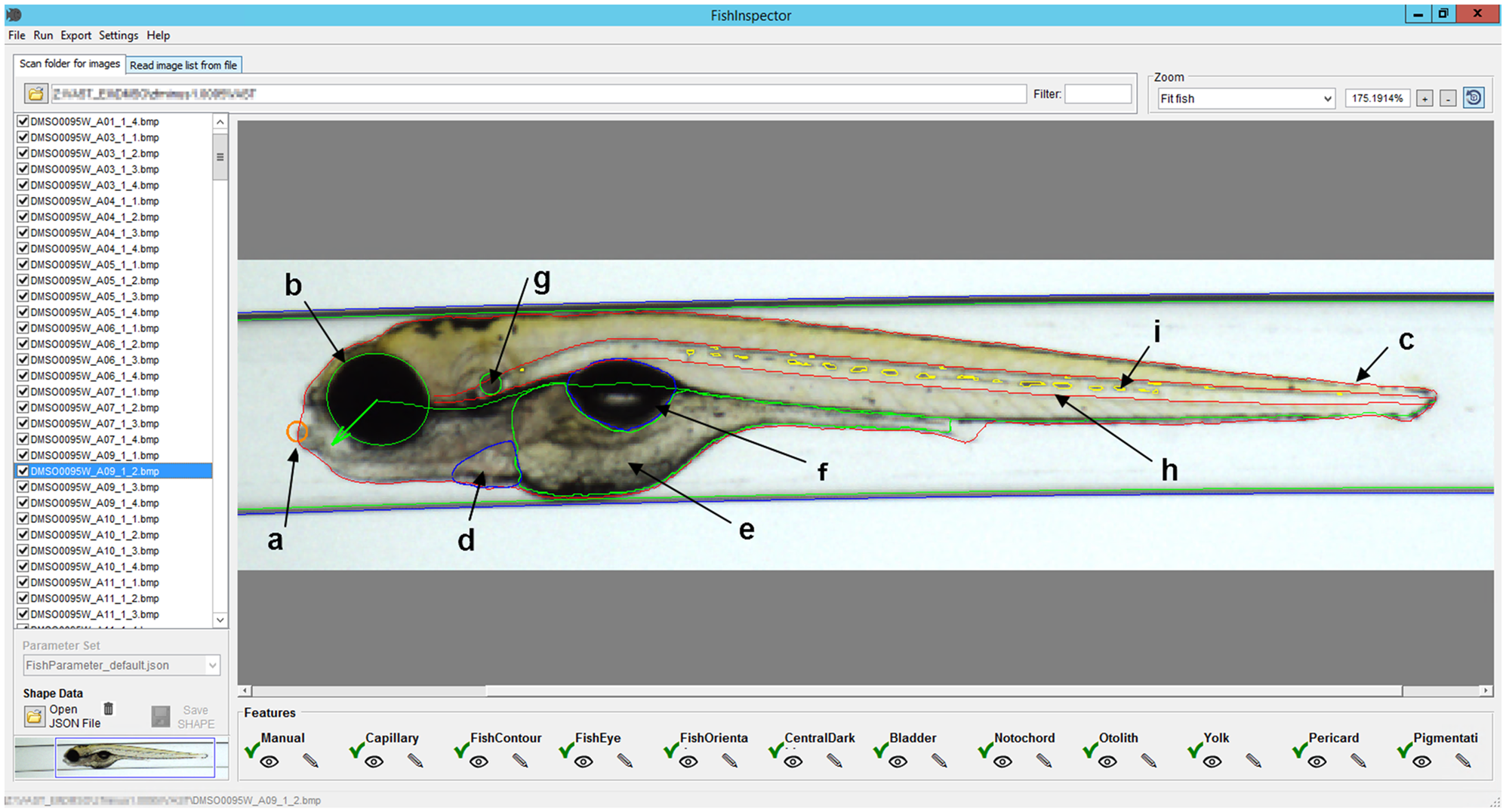 Screenshot of the FishInspector graphical user interface showing an image with detected regions of interest (ROIs) for each feature. The interface allows users to adjust and correct detected ROIs manually. The image shows the final corrected ROIs and the detected features are the following: a, lower jaw tip (orange); b, eye contour (green); c, fish contour (red); d, pericard (blue); e, yolk sac (green); f, swim bladder (blue); g, otolith (green); h, notochord (green); i, pigmentation (yellow). Colours refer to the online version.