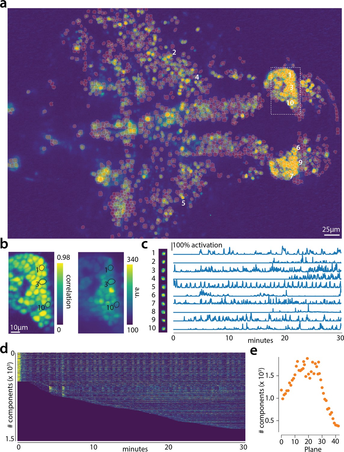 (a) Correlation image overlaid with the spatial components (in red) found by the algorithm (portion of plane 11 out of 45 planes in total). (b) Correlation image (left) and mean image (right) for the dashed region in panel (a) with superimposed the contours of the neurons marked in (a). (c) Spatial (left) and temporal (right) components associated to the ten example neurons marked in panel (a). (d) Temporal traces for all the neurons found in the FOV in (a); the initialization on the first 200 frames contained 500 neurons (present since time 0). (e) Number of neurons found per plane (See also Figure 6—figure supplement 1 for a summary of the results from all planes).
