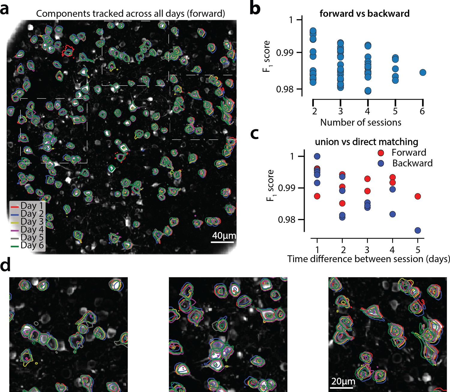 (a) Contour plots of neurons that were detected to be active in all six imaging sessions overlaid on the correlation image of the sixth imaging session. Each color corresponds to a different session. (b) Stability of multiday registration method. Comparisons of forward and backward registrations in terms of F1 scores for all possible subsets of sessions. The comparisons agree to a very high level, indicating the stability of the proposed approach. (c) Comparison (in terms of F1 score) of pair-wise alignments using readouts from the union vs direct alignment. The comparison is performed for both the forward and the backwards alignment. For all pairs of sessions the alignment using the proposed method gives very similar results compared to direct pairwise alignment. (d) Magnified version of the tracked neurons corresponding to the squares marked in panel (a). Neurons in different parts of the FOV exhibit different shift patterns over the course of multiple days, but can nevertheless be tracked accurately by the proposed multiday registration method.