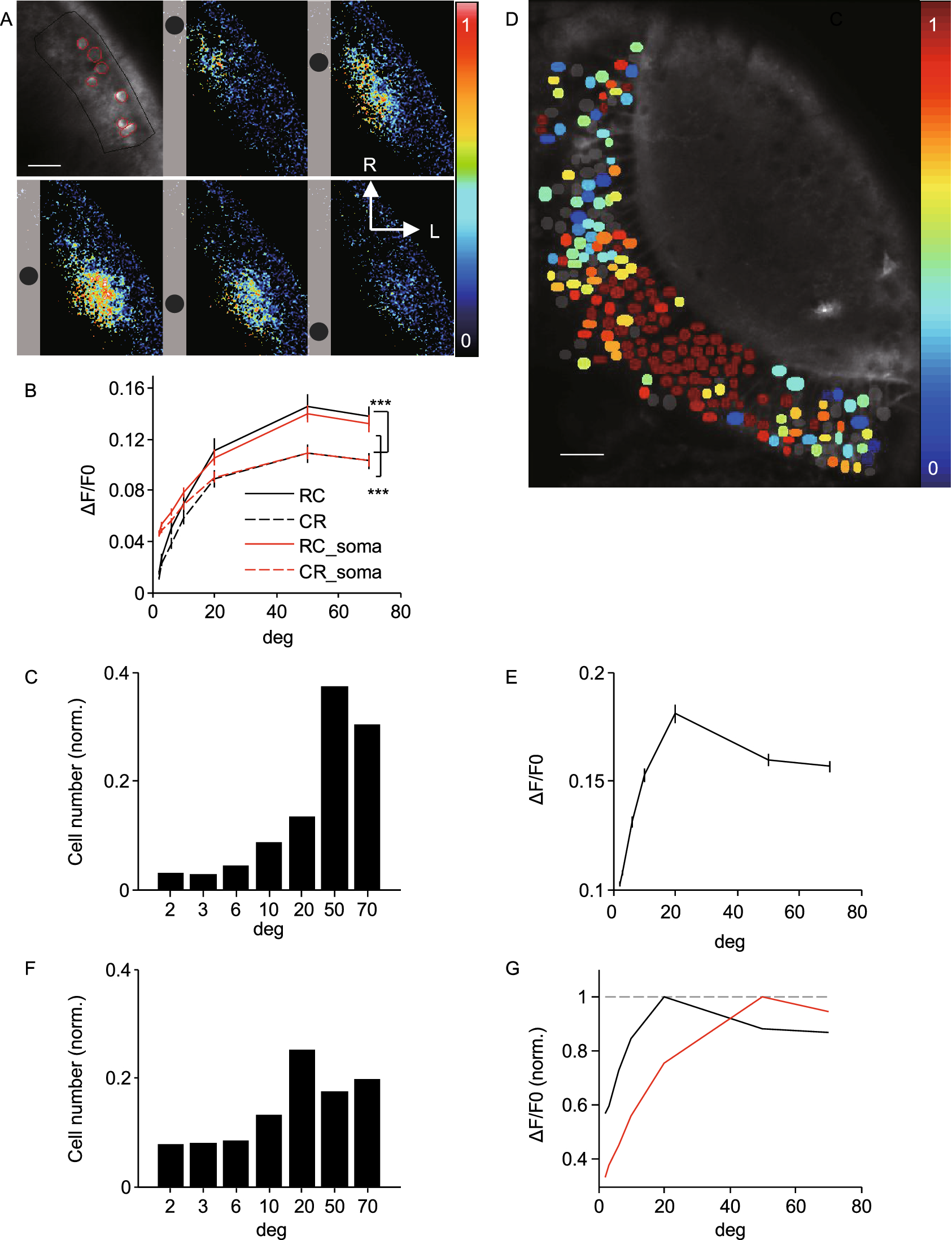 Size tuning of SINs. (A) Montage showing responses of SINs to moving dot stimulus of 10°, color-coded according to normalized responses. Relative position in each panel indicates direction of motion. Top left, fluorescence image showing analyzed ROIs demarcated by lines (population in black; somata in red). (B) Summary of responses to moving dots from population (n = 47 fishes, P = 2.3 × 10−10, two-way ANOVA) and responsive somata (n = 254/338, P = 1.8 × 10−9, two-way ANOVA). (C) Size preference distribution for all somata (n = 254/338 cells from 47 fishes). (D) Responses of PVNs to moving dot stimulus of 20°, color-coded according to normalized responses. Gray somata showing nonresponsive cells. (E) Summary of responses to moving dots from all somata (n = 1,651). (F) Size preference distribution from all somata. (G) Comparison of tuning curves between SINs (red) and PVNs (black)
