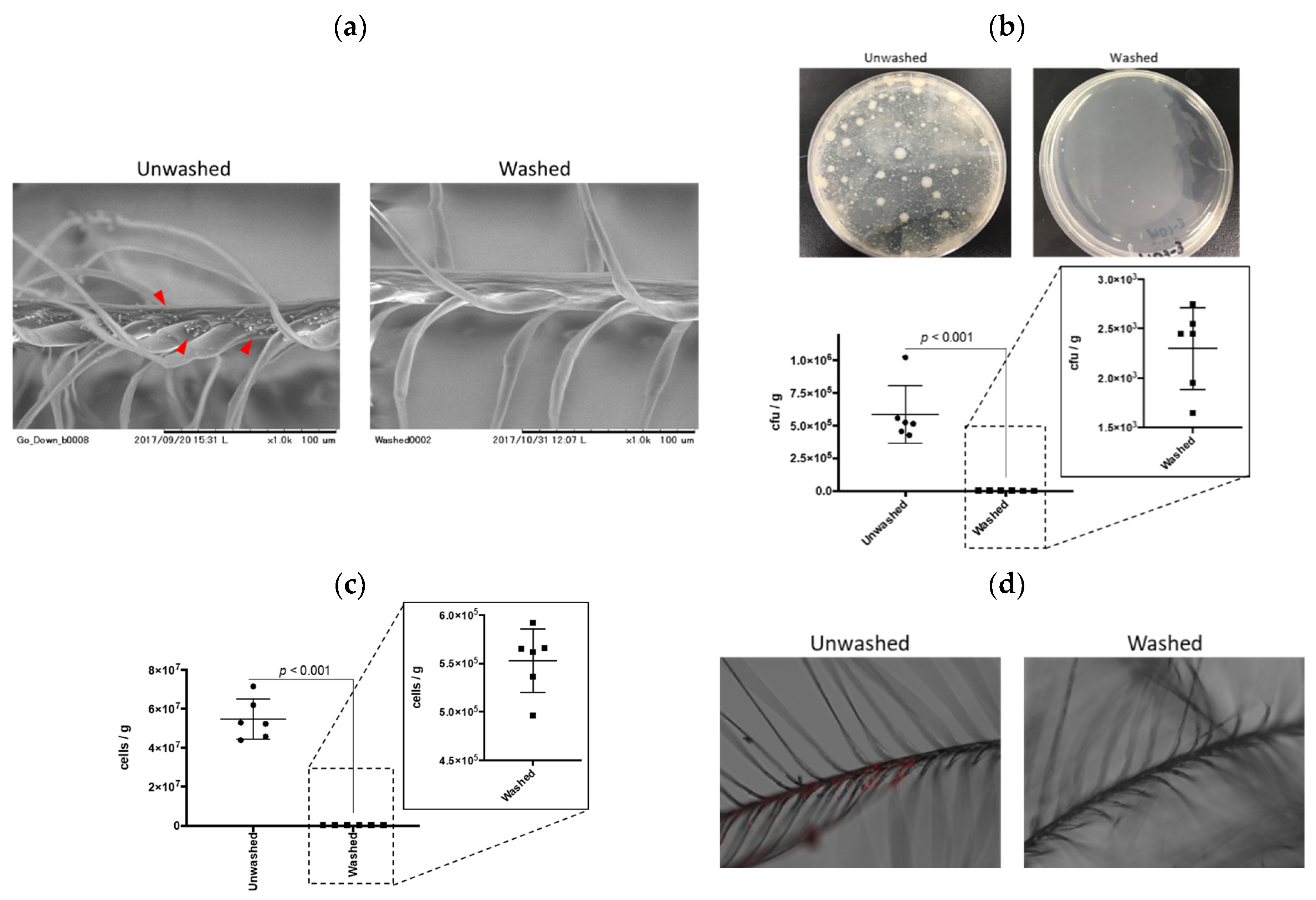 qPCR quantification of contaminated bacteria in down and feather samples. (a) Scanning electron microscopic images of unwashed and washed down and feather. Red arrowheads indicate debris. (b) Colony-forming unit (CFU) of down and feather samples. CFU was calculated using standard agar plate protocol. n = 6, error bars indicate SD. (c) qPCR analysis of bacterial numbers in down and feather samples. n = 6, error bars indicate SD. (d) Bacterial proliferation in the down and feather samples. Red signal indicates mCherry-expressing E. coli.
