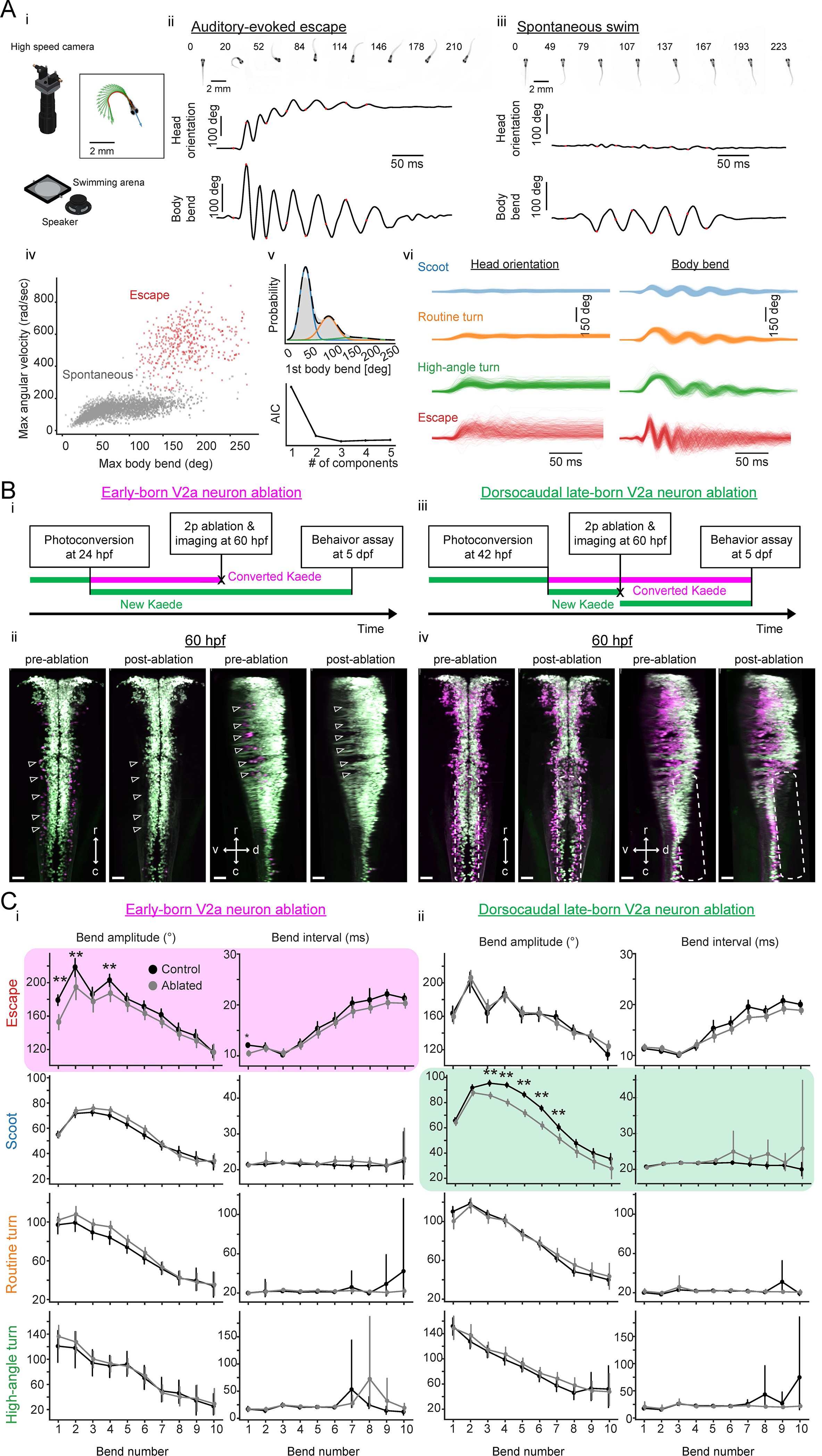 (A) Examined locomotion patterns. (i) Experimental setup. (inset) Example fish image showing tracking of head orientation and tail curvature (see Materials and methods). Blue arrow, head orientation; Red dots, tracked midline points; Green arrows, tangent vectors along the midline points. (ii) Auditory-evoked escape response. (Top row) Images of fish during escape response. The number on each the images is time from the stimulus onset in milliseconds. (Middle row) Time course of head orientation. (Bottom row) Time course of total body bend (see Materials and methods). (iii) Spontaneous swimming. Panels are organized similarly to ii but the number on each image is time from the movement onset in milliseconds. (iv) Scatter plot of maximum bend amplitude (during a swim episode) and maximum angular velocity for auditory-evoked escapes (n = 426 episodes, N = 10 fish, red points) and spontaneous swims (n = 6088 episodes, N = 15 fish, gray points). (v) (Top) Probability of initial bend amplitude for 6056 spontaneous swim events. A fit of gaussian mixture model identified three components. (Bottom) The Akaike information criterion (AIC) as a function of number of components. Three components led to the lowest AIC value. (vi) Overlaid traces of head orientation and total body bend for three identified spontaneous swim categories (Scoot, 3969 episodes, blue; Routine turn, 1565 episodes, orange; High-angle turn, 376 episodes, green) and auditory-evoked escape (Escapes, 381 episodes, red). (B) Femtosecond laser ablation of hindbrain V2a neurons. (i) Experimental procedure for the ablation of early-born V2a neurons. (ii) Maximum intensity projections before and after ablation at 60 hpf (left, dorsal view; right, side view). White open arrowheads indicate the locations of the early-born V2a neurons.(iii) Experimental procedure for the ablation of dorsocaudal late-born V2a neurons. (iv) Maximum intensity projections before and after ablation at 60 hpf (left, dorsal view; right, side view). White rounded rectangles indicate the location of the late-born dorsocaudal V2a neurons. r, rostral; c, caudal; d, dorsal; v ventral; scale bars, 30 μm. (C) Effects of hindbrain V2a neuron ablations on the bend amplitudes and periods (or intervals) of the four distinct locomotion patterns. (i) Effects of the early-born V2a neuron ablation. Bend amplitude and interval are quantified bend-by-bend from 1st bend to 10th bend (see Materials and methods). Asterisks mark significant differences between ablated and control fish (**p<0.01, corrected for multiple comparisons, Holm test). Error bars, 99 percent confidence interval. The swim category that showed significant effects are highlighted in magenta. (ii) Effects of the late-born dorsocaudal V2a neuron ablation. Panels are organized as in i. The swim category that showed significant effects are highlighted in green.