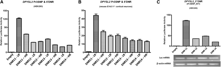 A dinucleotide repeat (DNR) in the DPYSL2 5′-UTR influences gene expression in in vitro reporter assays: Luciferase results from series of constructs containing LR/HR 3-SNP haplotype plus various DNR in HEK293 cells (A) and primary cortical neurons.* Risk 3-SNP haplotype with 13 DNRs (most common allele in DNR risk alleles) showed ~1.5- to 2-fold decrease in expression compared with construct having Risk 3-SNP haplotype with 11 DNRs in HEK293 (B) and primary cortical neurons (C). (D) these data were verified in HEK293 using semiquantitative expression level of transfected luciferase and endogenous Beta-actin mRNA were determined by reverse-transcription polymerase chain reaction (25 cycles).