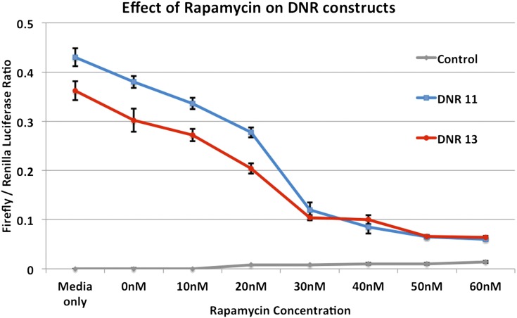 Effect of the mTOR inhibitor rapamycin on the DNR-driven expression of luciferase in HEK293 cells. The effects on the empty vector and the two 11 (WT) and 13 (Risk) DNR alleles are shown for a range of rapamycin concentrations. Rapamycin decreases luciferase activity for both alleles and reaches a plateau after ~30 nM. At this concentration the difference between the two alleles is no longer significant.