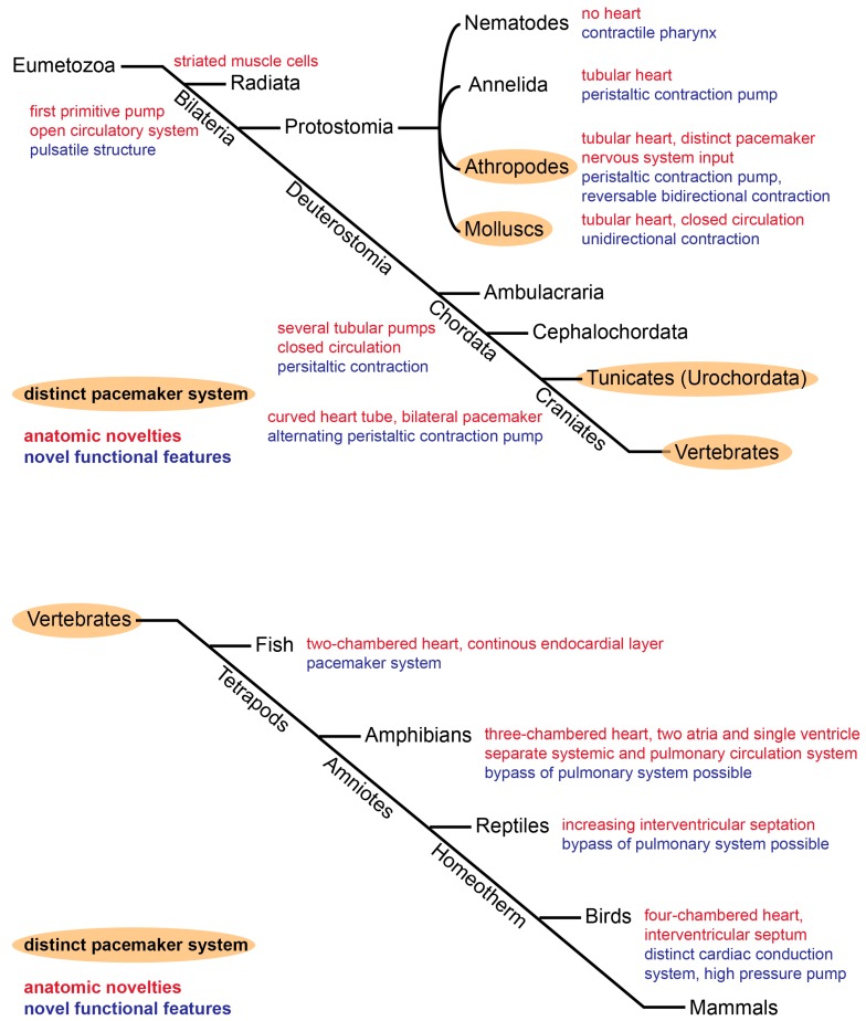 Evolutionary adaption of the cardiac circulation system, with regard to important morphological (red) and functional (purple) novelties. Heart and pacemaker evolution of existent Eumetazoans, from the presumptive common bilaterian ancestor to vertebrates (