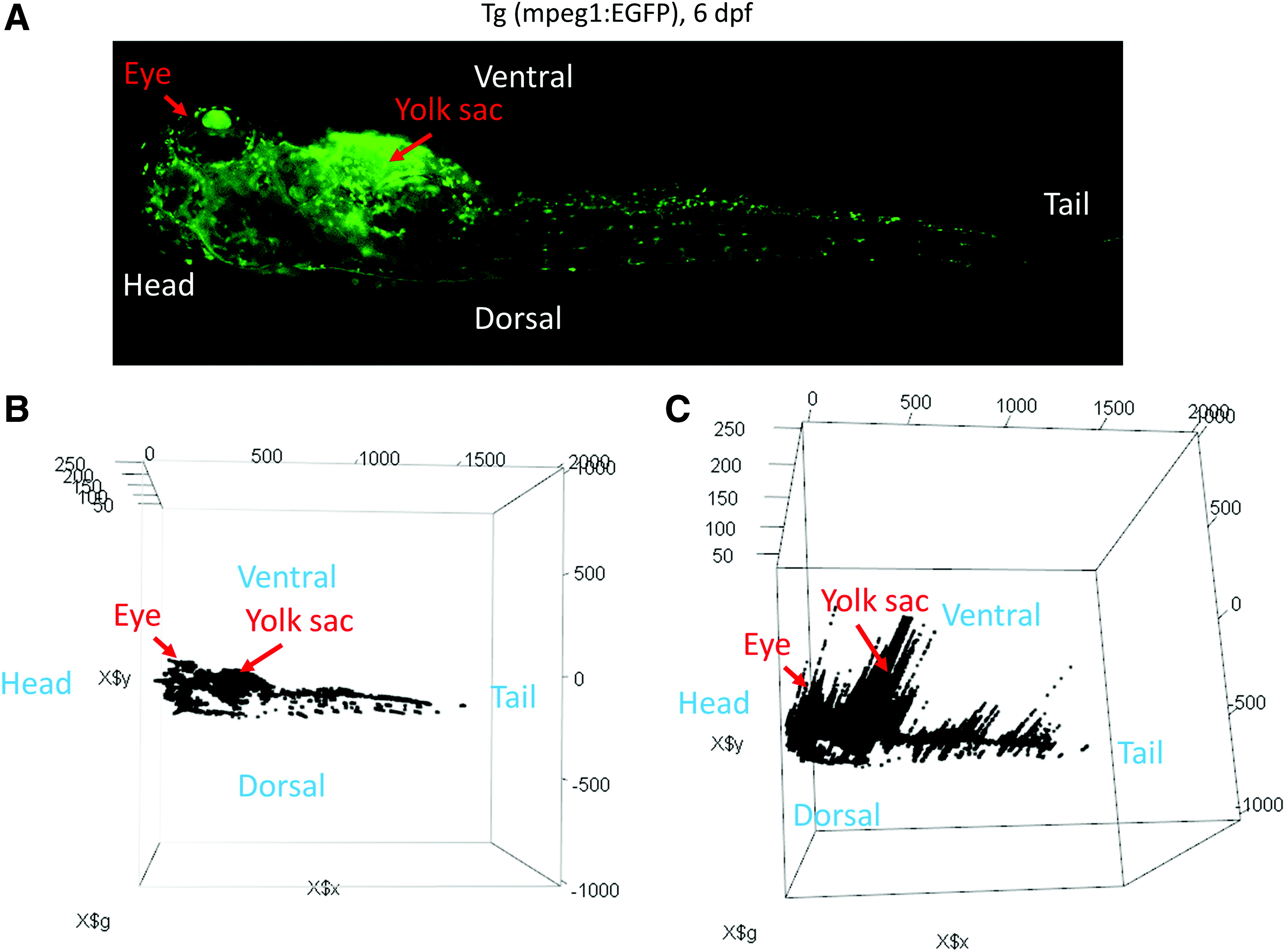 Construction of a 3D fluorescence intensity model from the ZF-Mapper data. (A) Input image of macrophage-EGFP zebrafish (tg [mepg1:EGFP], 6 days postfertilization). (B) The ZF-Mapper output data were imported to the “rgl” package of R and a 3D scatter plot was created. (C) Tilted image of (B). An interactive 3D model can be downloaded as Supplementary Data. 3D, three-dimensional. Color images are available online.