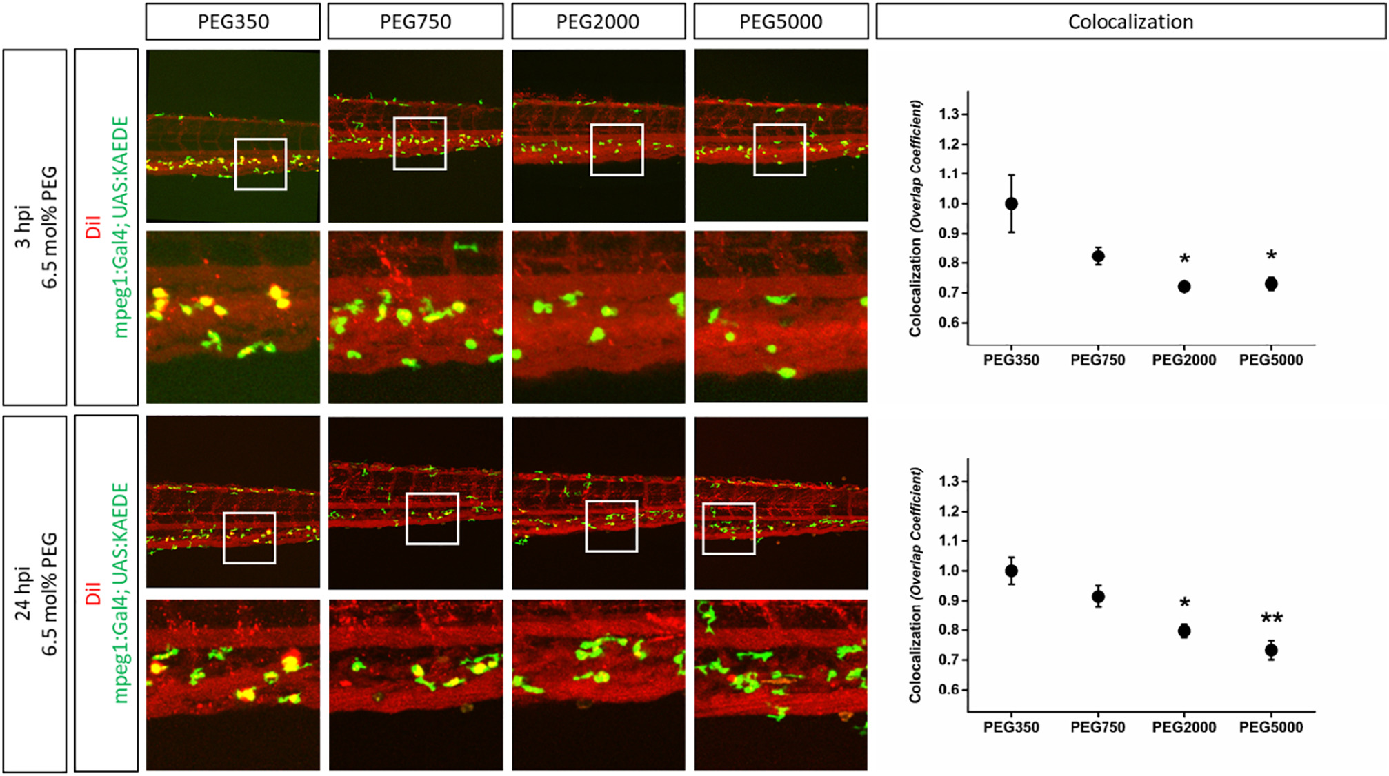 Influence of PEG modifications on macrophage clearance in transgenic zebrafish. DiI labeled liposomes modified with the indicated PEG molecular weights were injected into the blood circulation of zebrafish 2 days post fertilization. Confocal images were acquired 3 and 24 h post injection (hpi). Colocalization analysis of green fluorescent macrophages (KAEDE) and DiI labeled liposomes was performed based on normalized overlap colocalization coefficients. Values are means ± SEM, n = 3. *P < 0.1 or **P < 0.05 (multiple comparison using ANOVA assuming equal variance and Bonferroni correction) as compared to 90 nm sized PEG350 liposomes.