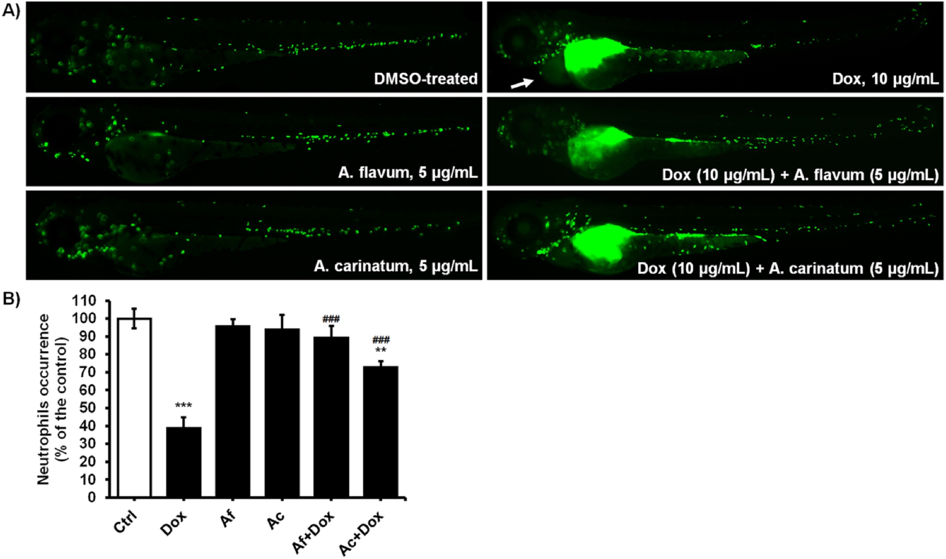 Myeloprotective effect of Allium extracts against Dox toxicity in Tg(mpx:EGFP) zebrafish embryos. Neutrophils occurrence (A) and the fluorescence intensity (B) upon different treatments are shown. While Dox caused severe neutrophils depletion (neutropenia) and large pericardial edema (arrow) at 10 μg/ml, extracts applied at a dose of 5 μg/ml had no toxic effect on neutrophils, while exerted both myeloprotective and cardioprotective effect in the combination treatments. Strong fluorescence in the yolk sac region in Dox-treated embryos originates from Dox accumulation. Statistically significant differences in neutrophil occurrence between the control (0.1% DMSO-treated) group and the groups upon single treatments (*P < 0.5, **P < 0.01; ***P < 0.001), and between the Dox-treated group and the groups upon the combination treatments (#P < 0.5, ##P < 0.01; ###P < 0.001) are denoted.