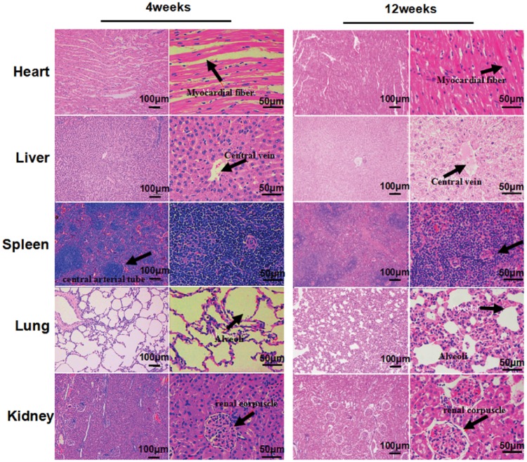 The GCC Stents have no significance effects on the main organs of rabbits at 4 and 12 weeks after implantation. The black arrows represent myocardial fiber, Central vein, Central arterial tube, alveoli and renal corpuscle