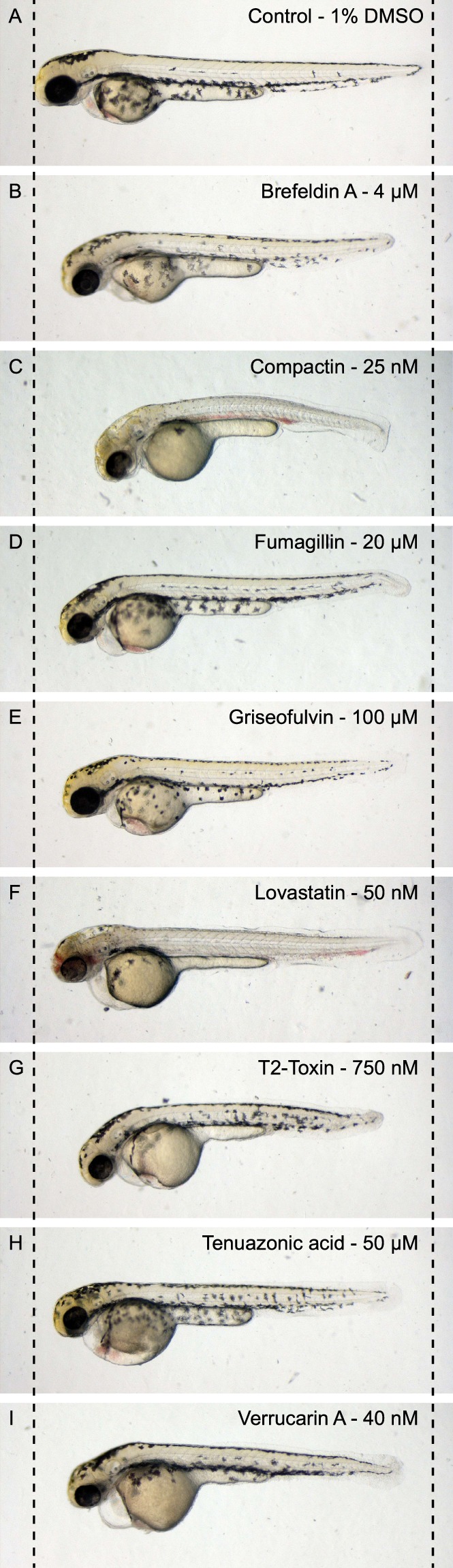 Reduced body axis extension phenotypes induced by commercially available compounds. Embryos were treated with compounds from 6 hpf onwards and were imaged at 48 hpf.