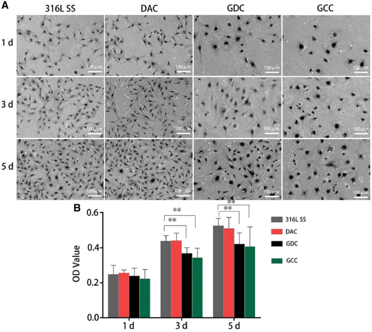 GDC and GCC Significantly inhibit the proliferation of VSMCs. VSMCs were plated on 316L SS coated with DAC, GDC or GCC. The images were taken at Days 1, 3 and 5, respectively (