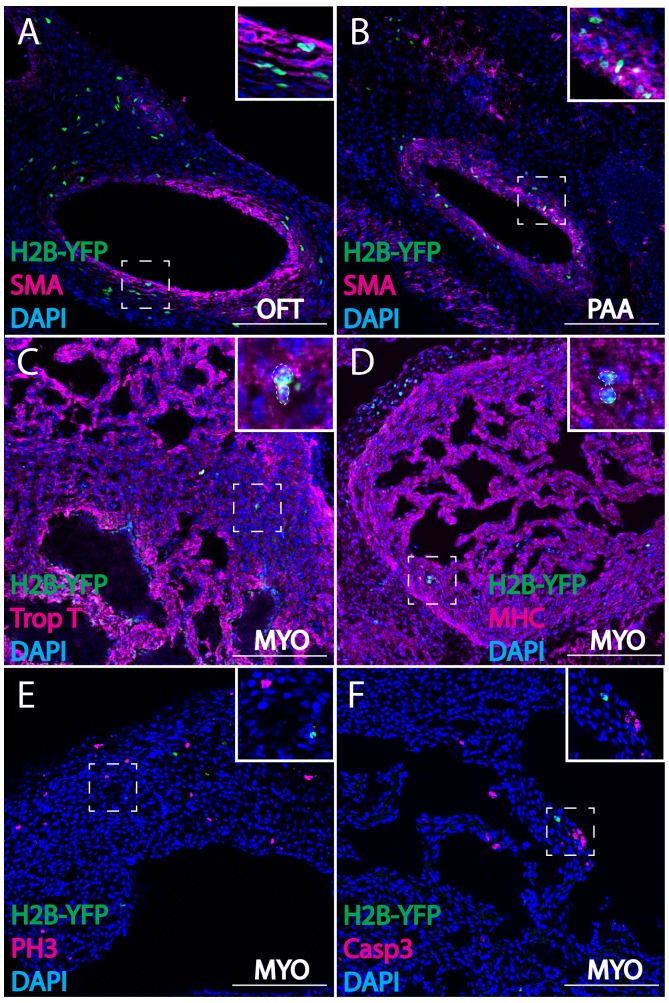 Figure 2 Cardiac crest-derived cells differentiate into smooth muscle and cardiomyocytes in avian embryos. (A, B) Retrovirally labeled cardiac crest cells (H2B-YFP, green) that migrate into the outflow tract (A, OFT) and pharyngeal arch arteries (B) express smooth muscle actin (SMA, magenta) marker. (C, D) Labeled cardiac crest cells that enter the ventricle express myocardial marker Troponin T (magenta) (C), and myocardial terminal differentiation marker Myosin Heavy Chain (MHC, magenta) (D) enclosed in dashed line. (E, F) Neural crest-derived cardiomyocytes are not actively dividing or undergoing apoptosis, as demonstrated by phosphohistone H3 staining (PH3, magenta) (E) and Caspase 3 staining (magenta) (F). Transverse view of E6 embryos. Separate channels are displayed in supplement 1. Scale bars: 100 μm.