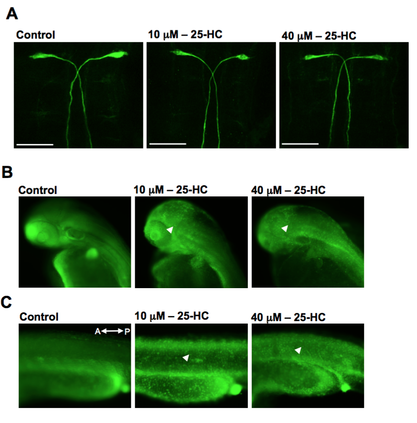 25-HC administration had no effect on Mauthner cells but caused cell death: (A) An immunostaining of 3A10, specific for Mauthner cells, showed no difference in the development of the cells. Acridine orange staining at 2 dpf in treated and un-treated larvae showed an increased cell death in the brain (white arrow heads) (B) and spinal cord (white arrow heads)(C) in a dose dependent manner. Each trial has a n of 7 for control and treated, repeated over 3 trials. A,P: Anterior and posterior side of the embryos respectively.