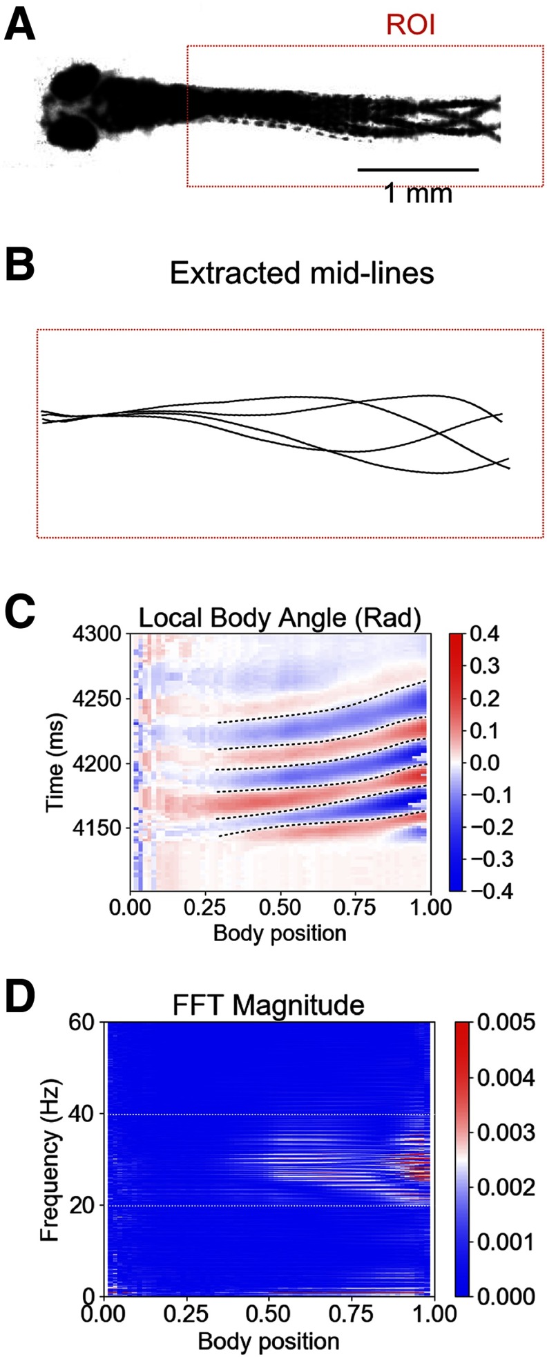 Larval zebrafish tail beat frequency during swimming is mainly between 20 and 40 Hz. A, Four superposed frames recorded during a single swimming episode of a 4-dpf larval fish. The red dotted box is the ROI in which the frame by frame analysis was performed. B, Examples of extracted midlines of the fish body over a swimming episode. C, Heat map of the local body angle amplitude. The fish body was divided into thirty segments from the caudal to the rostral end. The position of the body has been normalized such that the extreme caudal segment is 1.0, and the extreme rostral segment is 0.0. For every frame, the angle of each segment was computed and compared with the resting position. The resulting amplitude was assigned a color, blue for negative angles and red for positive angles. Black dotted lines are used to illustrate successive tail beats. D, For each body segment, a FFT was applied on a swimming episode and the result plotted as a heat map. Note that FFT outputs only positive values. The white dotted box highlights the 20- to 40-Hz range where the frequencies of tail beats reside.