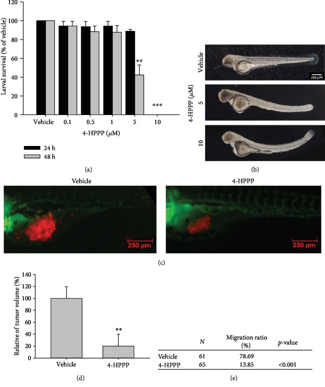 Effect of 4-HPPP on zebrafish-based xenografted NSCLC cells. (a) Survival rate of zebrafish larvae following 4-HPPP exposure. (b) The results showed that 5