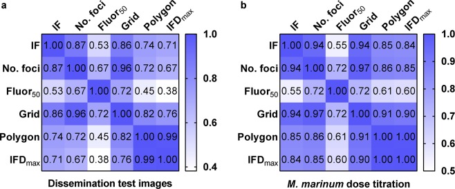 Correlation matrices of relationships between integrated fluorescence, number of foci and parameters of dissemination. Spearman rank correlation matrices of the associations between existing measurements of outcome of bacterial infection; integrated fluorescence (IF) and number of foci and our new measures of dissemination; fluor50, grid analysis (Grid), polygon area (Polygon) and IFDmax in (