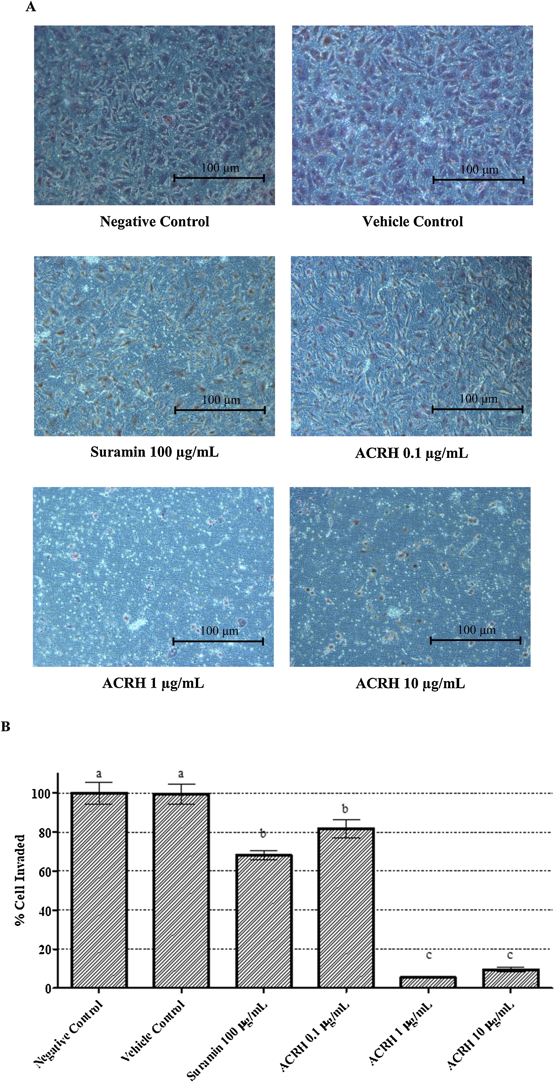 Inhibitory effect of ACRH on HUVEC invasion through 8 μm pore size PET membrane with a thin layer of Matrigel after 24 h. (A) Representative images of the invaded cells at the bottom of the membrane after 24 h treatment. The bottom of the well which consisted of invaded HUVEC with purple stained nuclei were photographed under the microscope at 200× magnification. (B) The effect of cell invasion was compared in between ACRH treated group with negative control group which quantified by determining the % invasion between negative control group and treatment groups. The quantitative data shown are mean ± SEM of 6 fields reading of each sample (n = 3). Different letters within the same patterned bar are statistically different (p< 0.05).