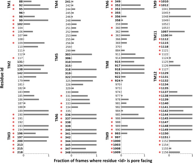 Comparing channel-lining residues identified in simulations to experimental data. Residues interacting with the Caver spheres were counted from all open frames (