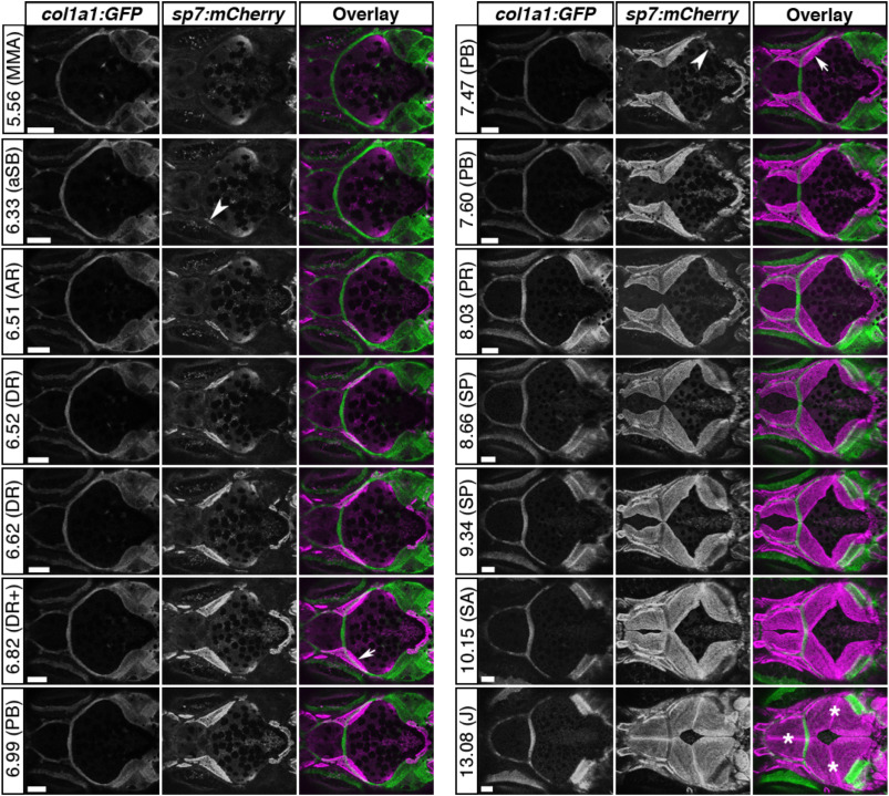 Fig. 3 Sequential live imaging of skull vault development. Confocal images are shown for a single Tg(col1a1:egfp; sp7:mcherry) zebrafish during the entire period of skull vault formation, with corresponding SL measurements in mm, and developmental staging in parentheses as in Fig. 2. Each set of panels represents maximum projections of z-stacks, separate GFP and mCherry channels and the overlay. Notable events are frontal bone initiation (arrowhead at 6.33 mm), planar bone growth towards apex of skull (arrows), parietal bone initiation (arrowhead at 7.47 mm), and suture formation (asterisks). Abbreviations as in Fig. 2, plus: metamorphic melanophore appearance (MMA); squamation onset posterior (SP); squamation through anterior (SA); juvenile (J). Scale bars = 100 μm.