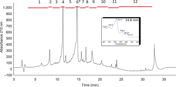 HPLC analysis and fractionation of the BV410 crude extract. The crude extract was collected as multiple fractions (red bars) which were individually tested for antifungal activity. Fraction 6 (*) with a retention time of 14.5–15.5 min showed potent antifungal activity. Fraction 6 was further purified, and a UV absorbance spectrum was obtained (inlet)