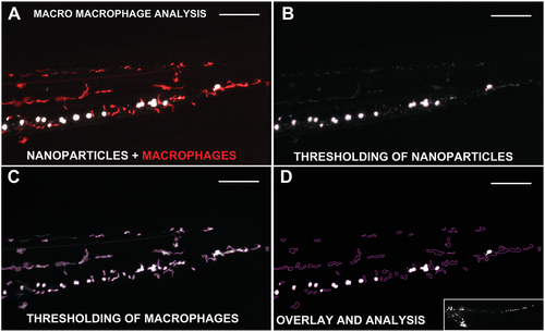 Macrophage uptake of NPs. Illustration of the steps undertaken by the MACRO for macrophage analysis to calculate the uptake of NPs. A) Zebrafish embryos injected with 623 nm liposomes without PEG (white) and fluorescent macrophages (red) are used for the analysis. B,C) NPs and macrophages are first thresholded, and D) their signals subsequently overlapped for analysis. The obtained values are normalized by the fluorescence of the whole zebrafish (panel (D), lower image).