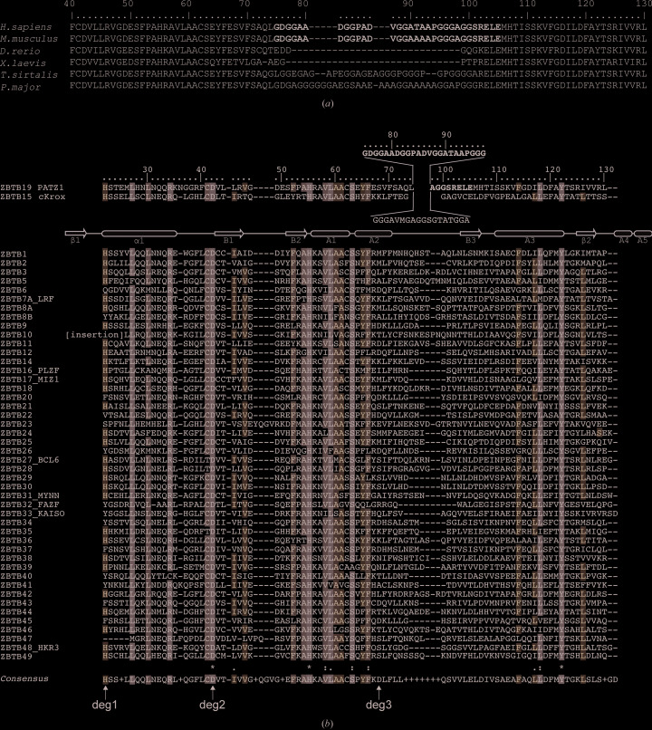 Sequence alignment of BTB domains of ZBTB transcription factors identifies a unique central region in PATZ1 that is conserved in mammals. (