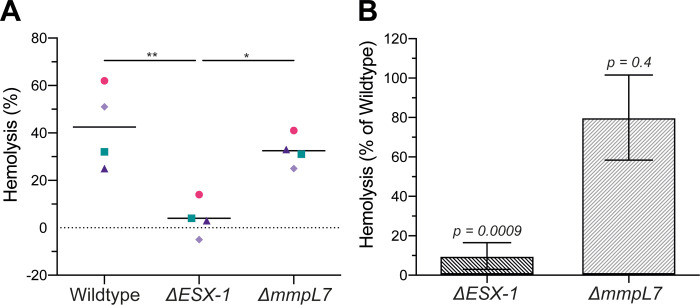 (A) 2-hour hemolysis of sheep red blood cells following incubation with wildtype, ΔESX-1 and ΔmmpL7 M. marinum relative to a Triton X-100 control. Statistical significance was determined by one-way ANOVA with Tukey's post-test. *p < 0.05, ** p < 0.01, otherwise, p > 0.05. Symbols represent matching experimental replicates. Pink circles, green squares, dark purple triangles and light purple diamonds are the first, second, third, and fourth replicates, respectively. (B) ΔESX-1 and ΔmmpL7 M. marinum hemolysis from (A) normalized to wildtype for each of four experiments. p-values, one-sample t-test against a hypothetical mean of 100% Error bars, mean +/- S.E.M.