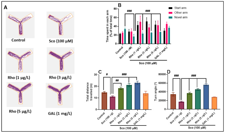 Rhoifolin (Rho: 1, 3, and 5 μg/L) improved the locomotion pattern and memory in the Y-maze test. (A) Representative locomotion tracking pattern of the control, scopolamine (Sco: 100 µM), rhoifolin (Rho: 1, 3, and 5 µg/L) and galantamine (GAL: 1 mg/L) treated groups. (B) Representation of the time spent in each arm (start, other, and novel arm) in different groups. (C) Representation of the total distance traveled by zebrafish in the tank in different groups. (D) Representation of the turn angle of zebrafish in the tank in different groups. Values are means ± S.E.M. (n = 10). For Tukey’s post hoc analyses: (B) Control vs. Sco (100 µM): ### p < 0.0001, Sco vs. Rho (1 µg/L): ### p < 0.0001, Sco vs. Rho (3 µg/L): ### p < 0.0001, and Sco vs. Rho (5 µg/L): ### p < 0.0001; (C) Control vs. Sco (100 µM): # p < 0.01, Sco vs. Rho (1 µg/L): ## p < 0.001, Sco vs. Rho (3 µg/L): ### p < 0.0001, and Sco vs. Rho (5 µg/L): ### p < 0.0001; (D) Control vs. Sco (100 µM): ### p < 0.0001, Sco vs. Rho (1 µg/L): ### p < 0.0001, Sco vs. Rho (3 µg/L): ## p < 0.0001, and Sco vs. Rho (5 µg/L): ## p < 0.0001.