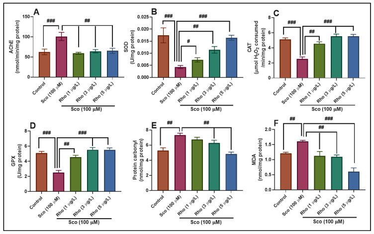Rhoifolin (Rho: 1, 3, and 5 μg/L) exhibited an anti-AChE effect and improved the antioxidant status in the zebrafish brain. (