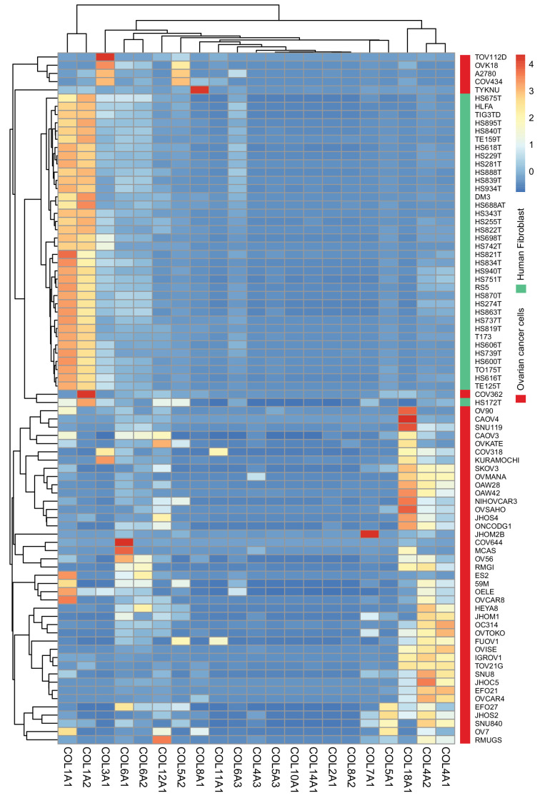 Unsupervised hierarchical cluster analysis and heat map visualization for expression of collagen-encoding genes among EOC cell lines (n = 47) and human fibroblast derived from various tissue origins (n = 37) using the CCLE dataset.