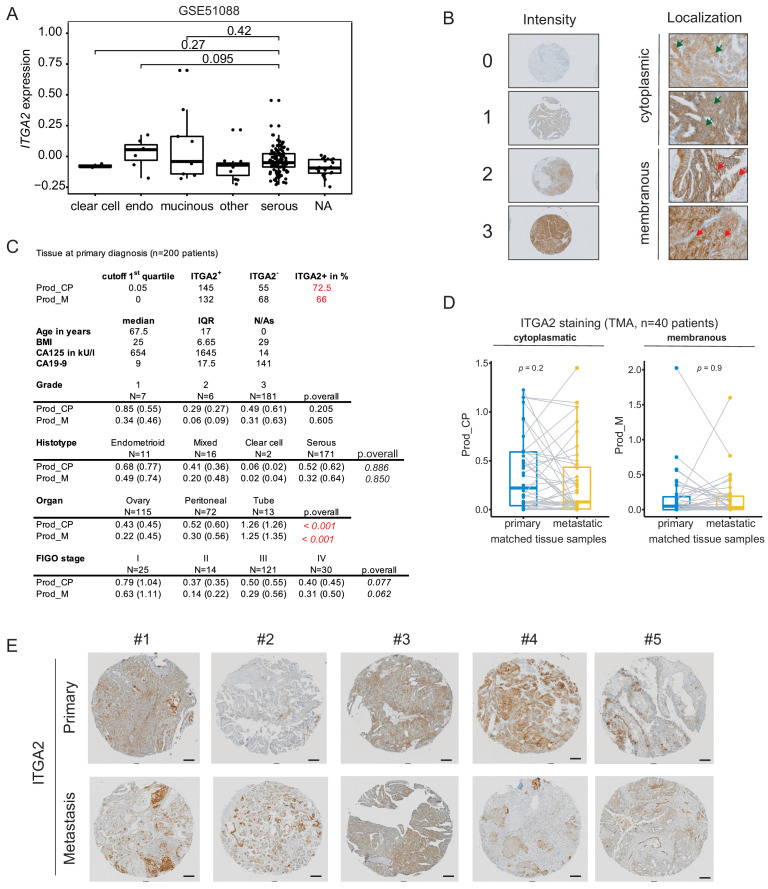 (A) ITGA2 expression among ovarian cancer histotypes from GSE51088 RNA-seq dataset (n = 172). (B) Representative IHC images show the intensity and localization of ITGA2 expression. Green and red arrows point out the positive cytoplasmic and membranous staining, respectively. (C) Summary of the product expression of ITGA2 in the tissue microarray according to grade, histotype, organ, and FIGO stage. (D) Weighted average scores of ITGA2 expression in matched primary and metastatic tissue samples (n = 40). (E) Representative images of IHC staining for ITGA2 protein in five matched primary and metastatic tumors of patients with epithelial ovarian cancer . Scale bar 0.2 mm.
