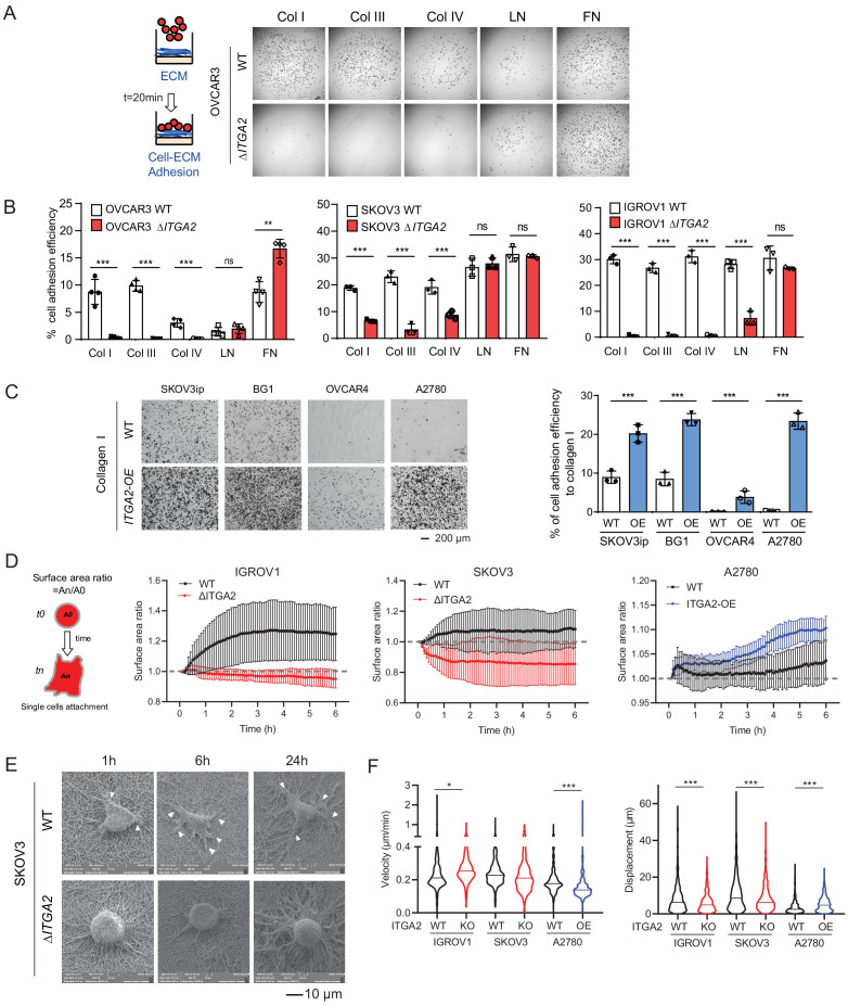 Figure 4 (A) Static cancer cell-ECM adhesion assay. Representative images showing OVCAR3 WT and ΔITGA2 cell adhesion to different ECM proteins, including collagen type I, III, IV, laminin, and fibronectin. (B) Bar charts with mean ± SD of the percentage of cell adhesion efficiency of OVCAR3, SKOV3, and IGORV1 cells from three independent experiments. (unpaired Student’s t-test, ***p<0.001) (C) Representative images and bar charts showing the cell adhesion to collagen I in four ITGA2-overexpressed EOC cell lines (unpaired Student’s t-test, ***p<0.001). Scale bar 200 μm. (D) Single cell adhesion on bioprinted collagen was monitored by time-lapse microscopy. Data represent the surface area ratio as mean ± SD (n > 300 single cells were analyzed per group). (E) Representative scanning electron microscope (SEM) images showing the SKOV3 WT and ΔITGA2 cellular adherence on bioprinted collagen at 1, 6, and 24 hr. White arrow indicates the polarized filopodia structure. Scale bar 10 μm. (F) Velocity and displacement of single cells on collagen-coated slides were measured (n > 300 per group from three independent experiments. Unpaired Student’s t-test, *p<0.05, ***p<0.001).