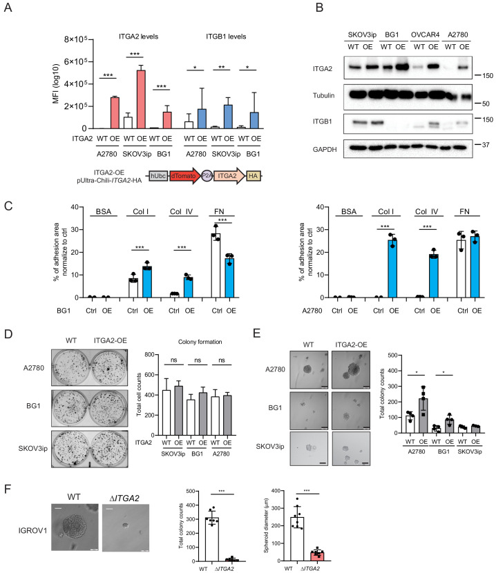 (A) The levels of ITGA2 and ITGB1 expression in WT versus ITGA2-overexpression (OE) in SKOV3ip, BG1, OVCAR4, and A2780 cell lines were determined by flow cytometry and (B) Western blot. (C) Cell-ECM adhesion assay of WT and ITGA2 overexpressed (OE) ovarian cancer cells. Bar chart summarizes percentage of cell to ECM adhesion efficiency from three independent experiments (***p<0.001, unpaired Student’s t-test). (D) Colony formation assay for WT and OE cells for 7 days. Bar chart represents the mean ± SD of total colony counts. (E) Anchorage-independent soft agar assay for WT and OE cells for 10 days in culture. Bar chart shows the quantification of total spheroid numbers (*p<0.05, unpaired Student’s t-test). Scale bar 200 μm. (F) Anchorage-independent growth for IGROV1 WT and ΔITGA2 cells for 10 days in culture. Bar chart shows quantification of total spheroid numbers and diameter in μm (***p<0.001, unpaired Student’s t-test). Scale bar 100 μm.
