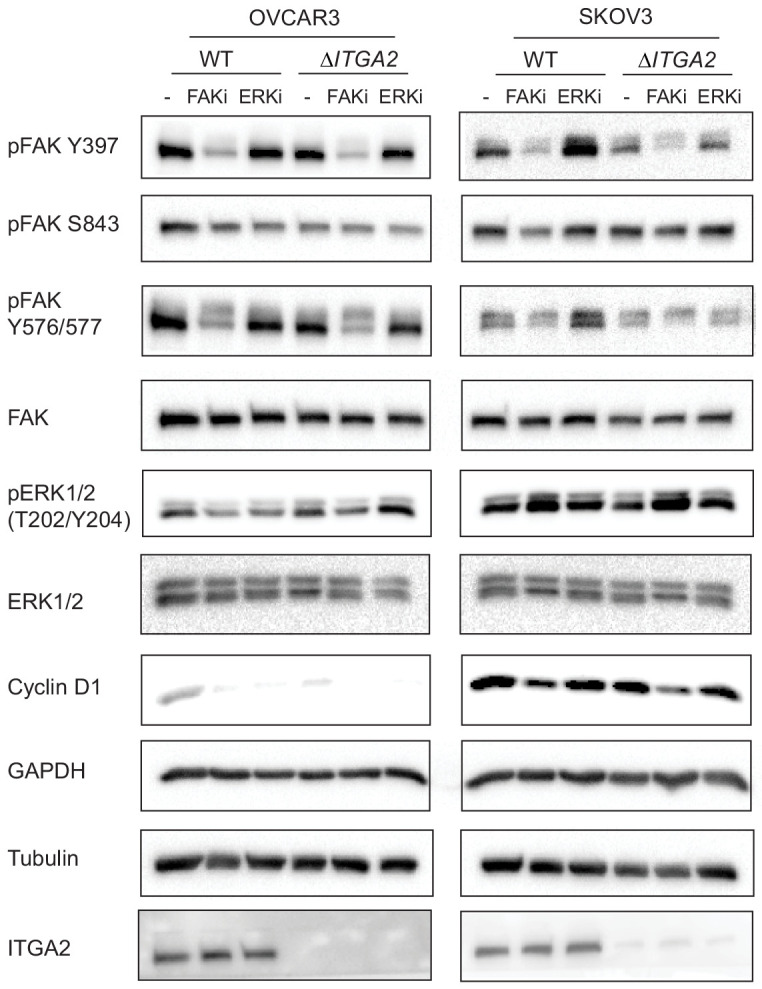 Immunoblot analysis shows downregulation of FAK and MAPK(ERK1/2) phosphorylation in WT and