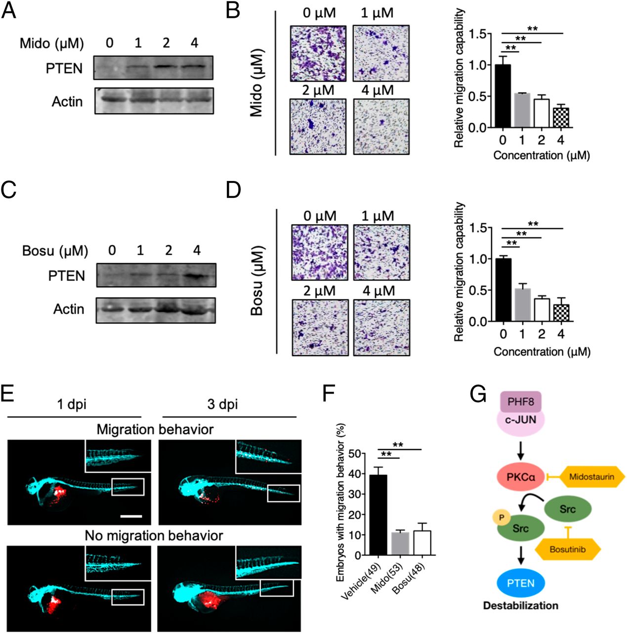 Fig. 6 Pharmacological inhibition of PHF8-PKCα-Src-PTEN blocks GC progression in vitro and in vivo. (A) Analysis of PTEN protein level in MKN28 treated with 0, 1, 2, or 4 μM of midostaurin (Mido). (B) Detection of migration activity of MKN28 treated with Mido by using Transwell migration assay. (C) Analysis of PTEN protein level in MKN28 treated with 0, 1, 2, or 4 μM of bosutinib (Bosu). (D) Detection of migration activity of MKN28 treated with Bosu by using Transwell migration assay. In B and D, data are presented as the average of three replicates ± SD **P < 0.01 (two-tailed Student’s t test). (E and F) Zebrafish xenotransplantation assays using Mido or Bosu. MKN28 labeled with CM-Dil (red fluorescence dye in the membrane) were ectopically injected into the yolk-sac parts of 2-d-old Tg(fli1:EGFP) (fish with green fluorescence in blood vessels) zebrafish embryos, followed by immersion in solutions containing 1 μM midostaurin or bosutinib (a sublethal dose) at 1 dpi. Fluorescence microscopic analysis was conducted at 1 dpi and 3 dpi. Representative fluorescence images of a zebrafish embryo displaying cell dissemination (Upper) or no migration (Lower) at 3 dpi (E). Cyan, blood vessel. (Scale bar, 100 µm.) Quantification of embryos with migration behavior in vehicle or drug-treated groups (F). Total number of embryos used in vehicle, Mido, and Bosu is shown in the bracket. Data were obtained from three independent studies. **P < 0.01 (two-tailed Student’s t test). (G) A schematic diagram shows that the PHF8-c-Jun complex contributes to GC progression through activation of PKCα-Src-dependent signaling to suppress PTEN. Targeting the PHF8-c-Jun-PKCα-Src-PTEN axis represents a prognostic/therapeutic target in advanced GC.