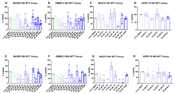 CysLT1 antagonists reduce cell viability in uveal melanoma cell lines. Graphs represent the effects of treatment with varying concentrations of dacarbazine (DTIC), quininib (Q1), 1,4-dihydroxy quininib (Q7), montelukast (Mon), and HAMI 3379 (HAMI) for 24 and 96 h in Mel285 (