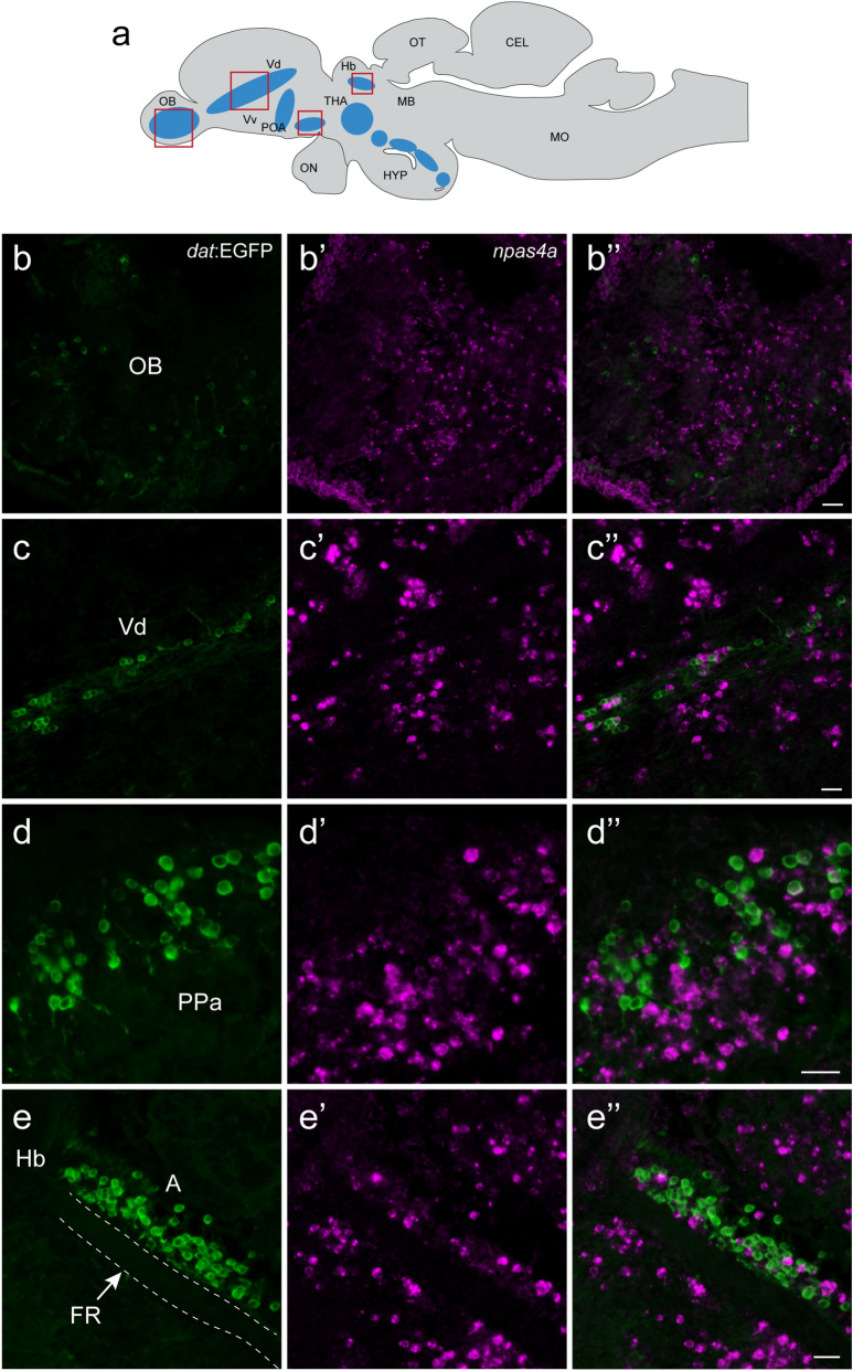 Expression of npas4a gene in the brain of transgenic dat:EGFP fish followed by 30-min post Kiss1 administration. (a) Schematic sagittal view of a zebrafish brain illustrating the distribution of dopaminergic cell population (blue-shaded zones) in the brain of zebrafish. Boxes with red indicate the boundaries of the photomicrographic illustrations in below (be). (be) EGFP (green)-labelled dopaminergic neurons in the olfactory bulb (OB, b); dorsal nucleus of ventral telencephalic area (Vd, c); anterior part of the parvocellular preoptic nucleus (PPa, d) and in the anterior thalamic nucleus (A, e) above the fasciculus retroflexus (FR). Although cells expressing npas4a mRNA (magenta) were seen in several brain regions (b'e'), there was no expression of npas4a in dopaminergic cells (b"e"). Scale bars 20 µm.
