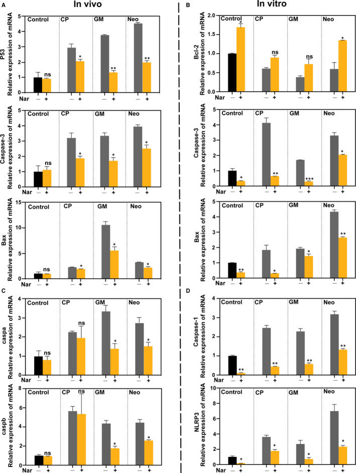Naringin attenuates the activation of the apoptotic‐ and pyroptosis‐related pathway in vitro and in vivo. (A and C) Real‐time PCR analysis of the mRNA levels of apoptotic (