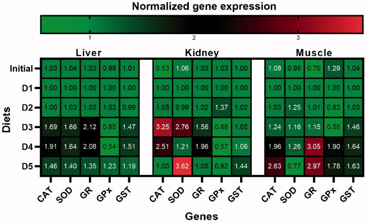 Gene expression heat map following different diet exposures. Values depict mean fold change (RQ) values versus control group. The bar is the colour key depicting fold change levels. Green signifies down-regulation and red upregulation. (For interpretation of the references to colour in this figure legend, the reader is referred to the Web version of this article.).