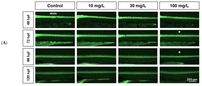 Comparison of spinal cord neuronal width between controls and acrylamide-treated zebrafish. (