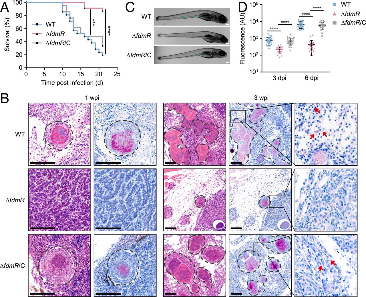Fig. 1 FdmR is crucial for M. marinum virulence. (A) Survival of adult zebrafish infected with M. marinum wild type (WT), ∆fdmR mutant, and complemented strain ∆fdmR/C. n = 25 per group. ***P < 0.001, ****P < 0.0001 by Kaplan–Meier method with a log-rank test. (B) Hematoxylin–eosin (Left) and Ziehl–Neelsen (Right) stains of adult zebrafish at 1 wpi and 3 wpi. (Scale bars, 100 μm.) Dotted lines delineate granulomas. The boxed areas are enlarged on the right and arrows indicate bacteria outside granulomas. Results are representative of three experiments. (C) Representative images of zebrafish larvae infected with the M. marinum strains carrying a fluorescent protein-expressing plasmid at 6 dpi. (Scale bars, 200 μm.) (D) Bacterial burdens of zebrafish larvae at 3 dpi and 6 dpi. n = 25 per group. ****P < 0.0001 by unpaired two-tailed t test.