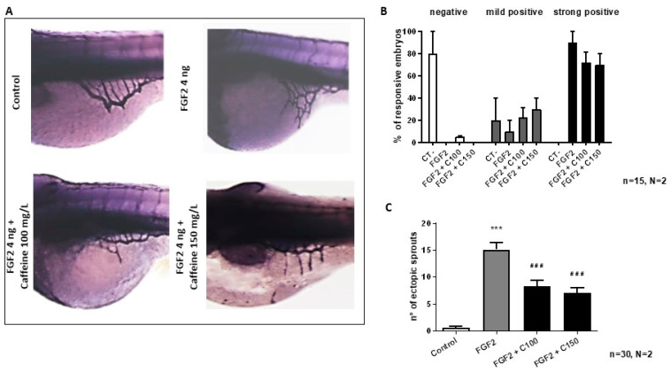 Evaluation of the effects of caffeine treatment on FGF2-microinjected embryos. (A) Representative picture of 72 hpf embryos after AP assay (magnification 63×). (B) Percentage of embryos showing negative, mild positive, and strong positive response following microinjection of FGF2, with or without caffeine treatment. Caffeine treatment in the FGF2 microinjected embryos did not show a significant decrease in either strong positive or mild positive response. However, analysis of the number of ectopic sprouts showed that caffeine treatment significantly reduced the number of ectopic sprouts in the FGF2-injected zebrafish embryos (C). In the bar diagrams: CT-: negative control; FGF2 + C100: FGF2 + caffeine 100 mg/L; FGF2 + C150: FGF2 + caffeine 150 mg/L. Statistical analysis was performed with GraphPad Prism software, version 8.3.0 (GraphPad Software, Inc., La Jolla, CA, USA). *** p < 0.001 between control and FGF2, ### p < 0.001 between FGF2 and caffeine treated groups (FGF2 + C100 and FGF2 + C150).