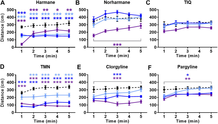 Effects of MAO inhibitors on total distance traveled. Total distance traveled during the NTT is presented for (A) harmane (1, 3, and 10 mg/L) (B) norharmane (0.3, 1, and 3 mg/L) (C) TIQ (10, 30, and 100 mg/L) (D) TMN (3, 10, and 30 mg/L) (E) clorgyline (10, 30, and 100 mg/L), and (F) pargyline (10, 30, and 100 mg/L). Black dashed line = vehicle control; light blue = lowest concentration; blue = middle concentration; purple = highest concentration. The sample size is detailed in the legends for Figures 3, 4. Data are expressed as mean ± SEM. *p < 0.05; **p < 0.01; ***p < 0.001. Abbreviations: NTT = novel tank test; TIQ = 1.2,3,4-tetrahydroisoquinoline; TMN = 2,3,6-trimethyl-1,4-naphthoquinone.