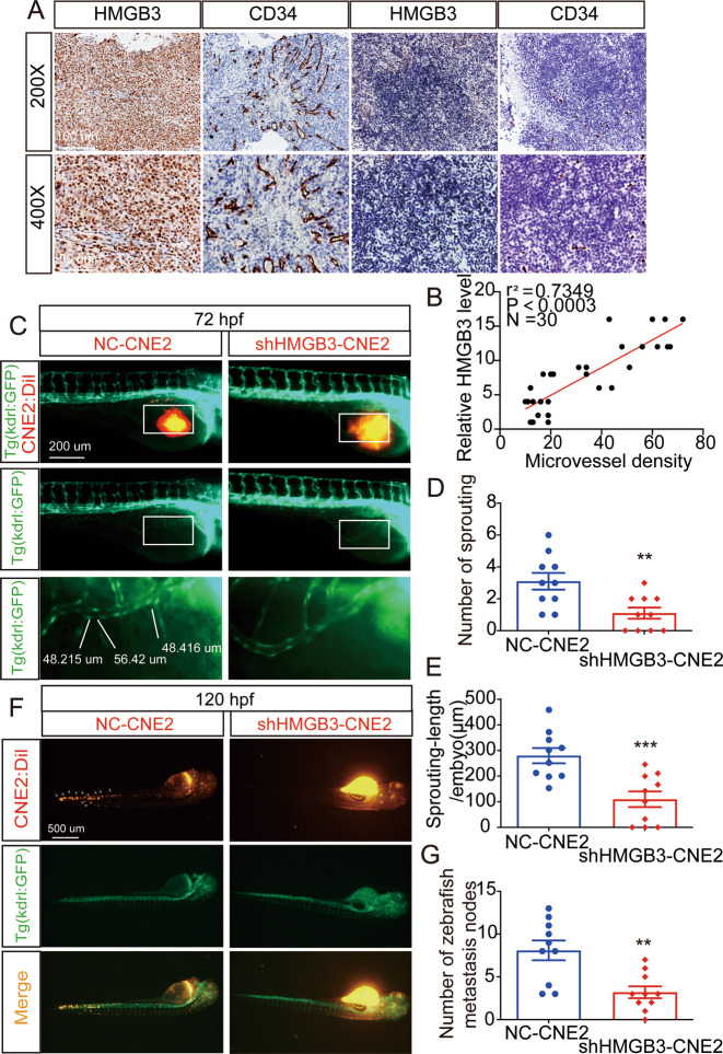 Fig. 5 A Representative images of IHC for CD34 and HMGB3 in NPC tissues. The scale bar in 200× images represents 100 µm. B Spearman correlation between HMGB3 score and MVD in NPC patients. Pearson correlation coefficient (r2) and P value are shown. C The overall shape of 96 hpf embryos after injection of about 10 nL of Matrigel/CNE2-NC or Matrigel/CNE2-shHMGB3 solution in the perivitelline space at 48 hpf. White boxes indicate regions of pictures shown in the bottom two pictures and the analysis of the subintestinal venous plexus (SIV) was conducted. The scale bar represents 200 µm. D Quantifications with the number of sprouting of ten embryos per group. E Quantifications with the sprouting-length per embryo of ten embryos per group. F At 120 hpf, the migration of CNE2 cells was measured using fluorescence microscopy. The scale bar represents 500 µm. G Quantification of migratory cell numbers of ten embryos per group. Mean ± SD, **P < 0.01, ***P < 0.001, student’s test.
