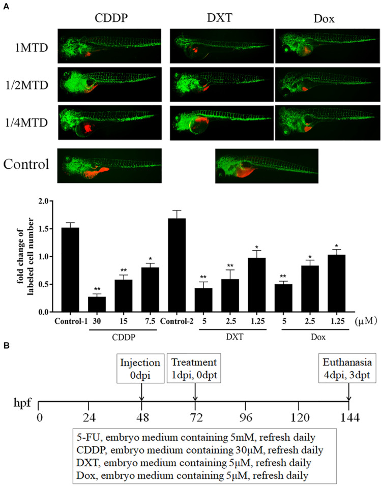 FIGURE 2 CDDP, DXT, and Dox dosing in zebrafish. (A) zCDXs engrafted SGC7901 cells (dyed with red fluorescence using DiL) were treated with CDDP, DXT, or Dox at their 1/4, 1/2, and 1 MTD, and they inhibited cell proliferation in a dose-dependent manner (control-1, embryo medium for CDDP assay; control-2, embryo medium containing 0.1% DMSO for DXT or Dox assay) (*P < 0.05, **P < 0.01 vs. control-1 or control-2). (B) A protocol for preclinical chemosensitivity test in the zebrafish larvae cancer model was developed.
