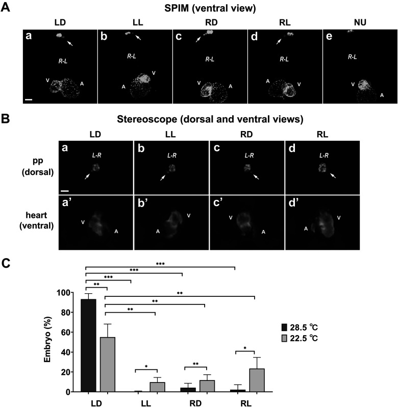 Laterality defects of the brain and heart in zebrafish embryos. (A) Ventra lviews of the parapineal (arrow) and the myocardium in 48 hpf Tg(foxd3:EGFP/myl7:EGFP) embryos (a–e) visualized using 3D SPIM, which revealed their laterality defect at the cellular level. 10× lens; 1.5× zoom; scale bar, 50 µm. (B) Dorsal views of left-right asymmetry of the pineal complex (a–d) and ventral views of the heart (a’–d’) were imaged at 4 days post-fertilization using a fluorescent stereomicroscope. Scale bar, 50 µm. (C) Embryos treated with and without cold shock at 22.5°C (n = 226) and 28.5°C (n = 795), respectively, were examined for their laterality defects of the parapineal (arrow) and cardiac looping at 72hpf. LD, left parapineal(L)and dextral heart looping (D); LL, left parapineal(L)and leftward heart looping (L); RD, right parapineal (R) and dextral heart looping (D); RL, right parapineal (R) and leftward heart looping (L); NU, no parapineal (N) and unloop heart (U); pp, parapineal; R-L, right-left sides; L-R, left-right sides; A, atrium; V, ventricle. *P< .05, **P< .01, and ***P< .001 by Student’s t-test.