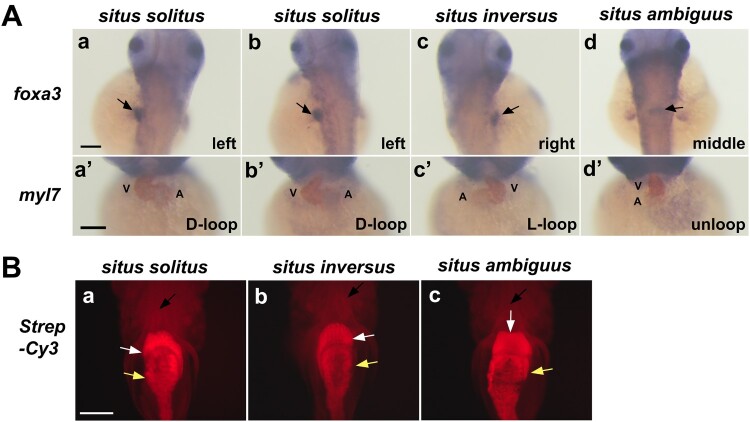 Figure 3. Situs solitus, situs inversus, and situs ambiguus in zebrafish visceral organ development (A) Whole mount double in situ hybridization reveals laterality of the developing liver (arrow) using a foxa3 RNA probe (purple) in the dorsal view of control (a) and experimental embryos (b–d) and the cardiac looping using the myocardial marker myl7 (brown) in the ventral view of control (a’) and experimental embryos (b’–d’). A, atrium; V, ventricle. Scale bars, 150 µm. (B) Ventral views of 6 dpf larvae stained with Streptavidin-Cy3 (Strep-Cy3) to visualize situs solitus (a), situs inversus (b), and situs ambiguus (c) of the heart (black arrow), liver (white arrow) and gut (yellow arrow). Scale bar, 150 µm.